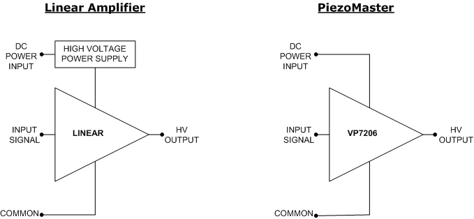 Efficiency Comparison The overall efficiency of the VP7206 amplifier series is approximately twice as good as a linear amplifier. Shown below is a typical linear amplifier with an external high voltage power supply compared with the PiezoMaster amplifier that does not require a high voltage power supply. Since the PiezoMaster amplifier steps up the output voltage to precisely that voltage demanded by the signal input, there is no need for a high voltage power supply and no corresponding loss of efficiency.